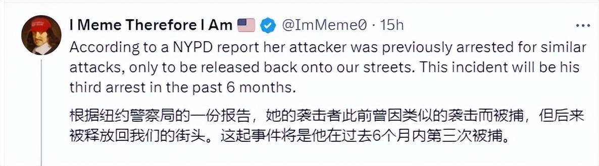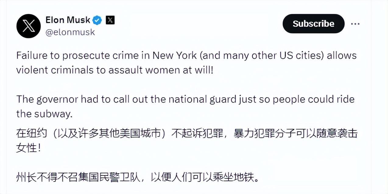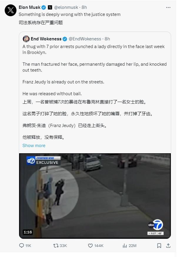所以,馬斯克就說,美國司法系統存在嚴重問題。美國許多城市都不起訴犯罪,暴力犯罪分子可以隨意襲擊女性。