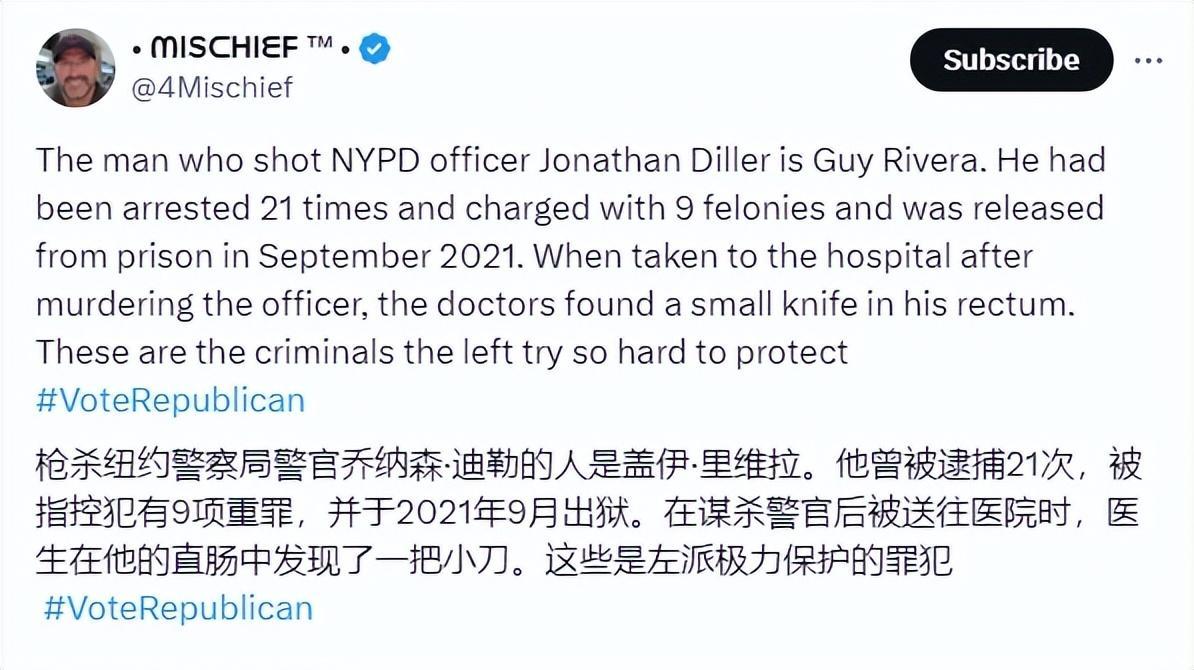 這個警察呢也是啥都沒做,就是上去問司機,你爲什麼把車停在公交車站,然後就被這個司機槍殺了。事後一查,這個司機叫蓋伊·里維拉,因爲毒品和暴力犯罪,已經被捕21次,其中9項重罪,去年4月還因槍支指控被捕,但是結果呢,他不是還好好的出現在街頭嘛。