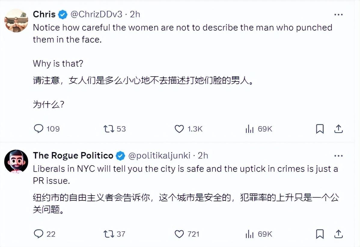 離奇的現象總會有原因啊,啥原因呢?美國網友認爲啊,都是輕罪無罪化的結果,你被打了一巴掌,就算抓到了人,警察頂多教育他一下,又放走了,更何況,被打的都是獨自走在街上的女人,打人的又是男人,你也抓不到他,他就不會受到任何處罰。