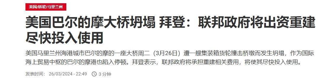 拜登說:聯邦政府將承擔重建相關費用。不過說完之後,他補了一句,希望國會支持我的努力。現在呢,美國交通運輸部,已經批了6000萬美元的緊急救濟資金,作爲大橋緊急維修、設計和重建的初始費用首付,但是這點錢,遠遠不夠,後續還要更多錢。
