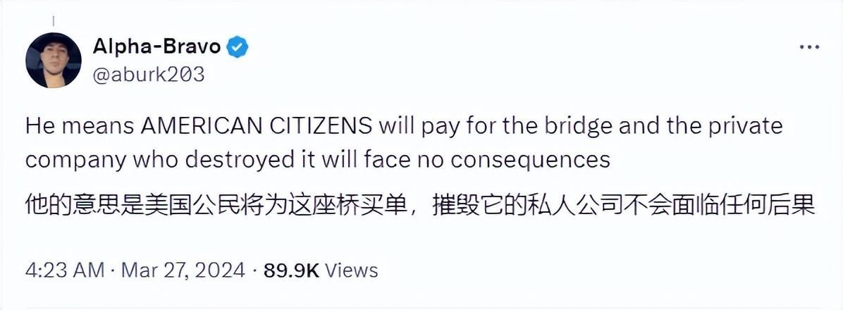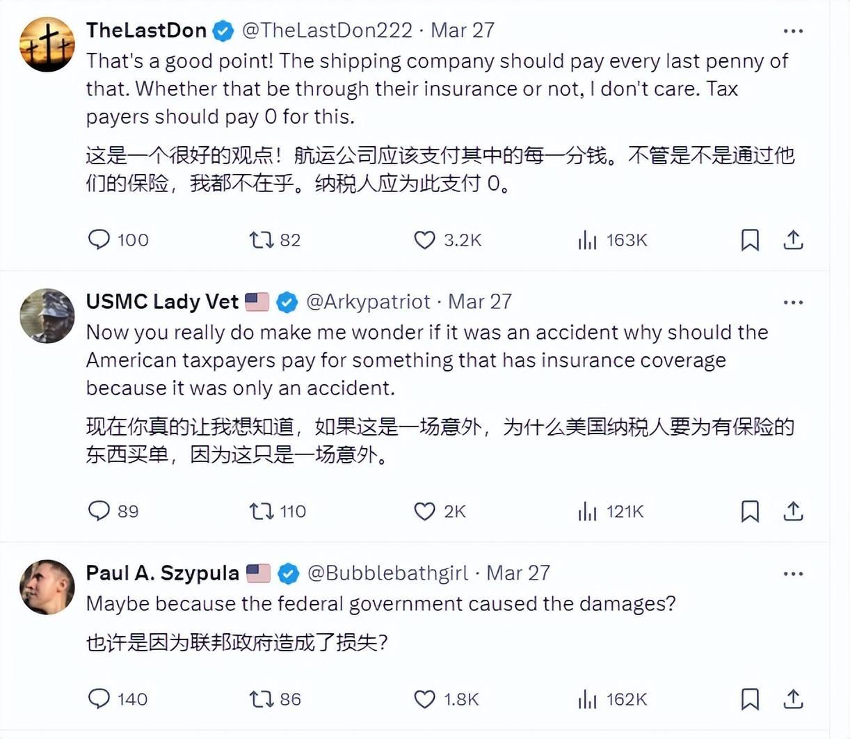 美國民衆可不願意啦,說,橋是歐洲公司租的船撞斷的,憑啥要美國公民買單,撞毀它的私人公司咋不出錢?