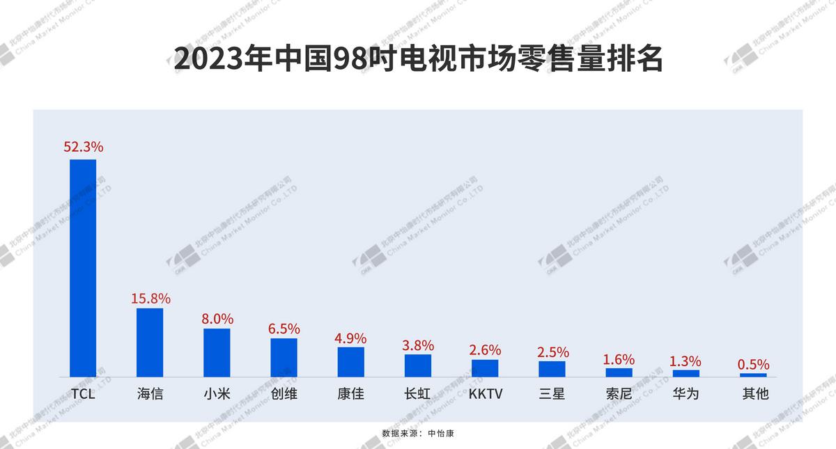 同時,在中怡康的2023年中國98寸電視市場零售量排名中也可以看到,大屏電視市場幾乎被國產電視佔領。