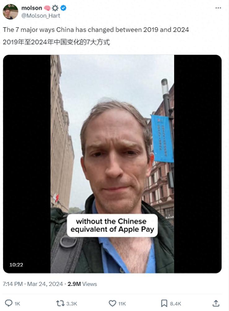最近總有些事,大殖子們破防。有個叫做莫爾森的美國人,以前是一個出了名的中國黑。時隔5年後,他重新來到中國,然後他拍了一段視頻,講述了他認爲的,2019年-2024年中國的七大變化,在我錄視頻的時候,這個視頻播放量已經到了200多萬,引發了廣泛的關注。那是哪七大變化呢?