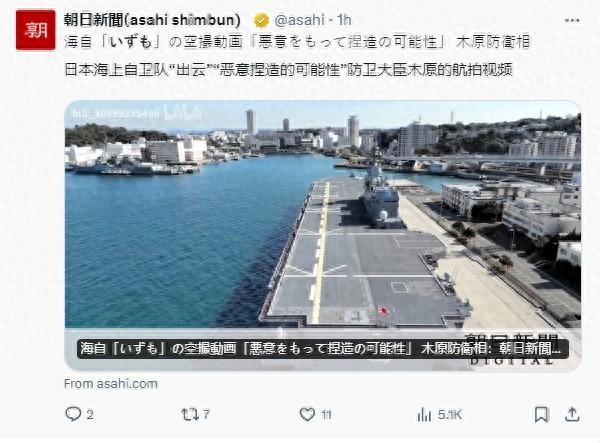 日本人嚇壞了啊,說是一個無人機在出雲號航母頭上飛,還沒人發現。現在就有意思了啊,日本朝日新聞說,“無人機降出雲”的,視頻是假的,是AI做的,根本沒有這回事。