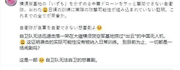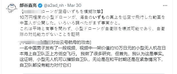 日本慶應大學研究員部谷直亮表示,我做了很多研究,認爲這是事實,這證明小型無人機,無論在平時,還是緊急情況下,都可以摧毀自衛隊,而自衛隊根本沒有能力對付它們。