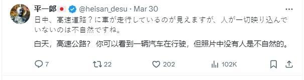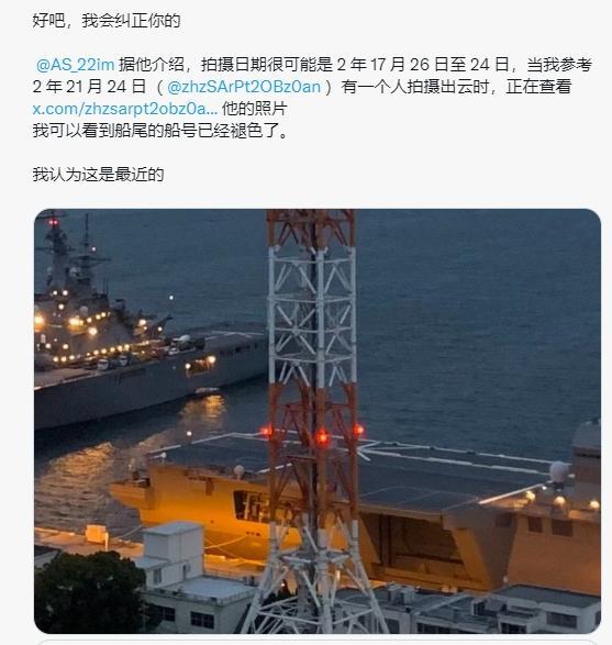 消息一出,很多日本網友也都跟着說,這肯定是AI合成的,因爲這是白天,周圍還有公路,路上雖然有車,但是周圍沒有人,也沒有鳥。細心一點的日本網友還發現,視頻中出現的航母舷號,只有8,而出雲號航母船尾寫着“83”,所以認爲這個視頻是假的。