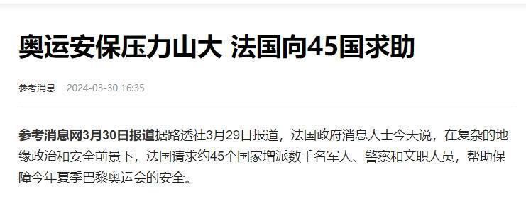 安檢級別高是高,可是法國還是搞不定,原因是因爲財政緊張,法國這些年裁掉了不少警察,而這次巴黎奧運會又太浪,搞了那麼大陣仗,大巴黎的5萬名警察根本不夠用,而法國這兩年,只能說,不愧是革命老區,農民鬧完警察鬧,巴黎鬧完馬賽鬧,青年鬧完老人鬧,反正就是不讓人消停,本來警力就不夠用,應付日常治安都夠嗆,根本沒法抽調警力支援大巴黎。咋辦?法國有辦法,各位大爺行行好,有警犬的支援警犬,沒警犬的支援警察。法國向45個國家尋求安保協助,而且,要求還挺高,都是技術工種,機動旅和馬術旅、文件欺詐專家、排雷專家、反無人機專家和嗅探犬小組。