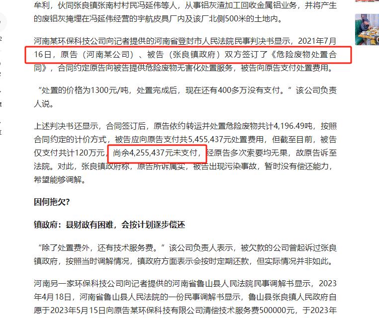 他們與張良鎮政府簽訂了《危險廢物處置合同》。價格爲每噸1300元,結果項目結束了對方說沒還款能力!你說公職人員成老賴的話,會影響徵信嗎,魯山縣經不起網友深扒,按照已經披露的數據顯示,還欠了51個億!