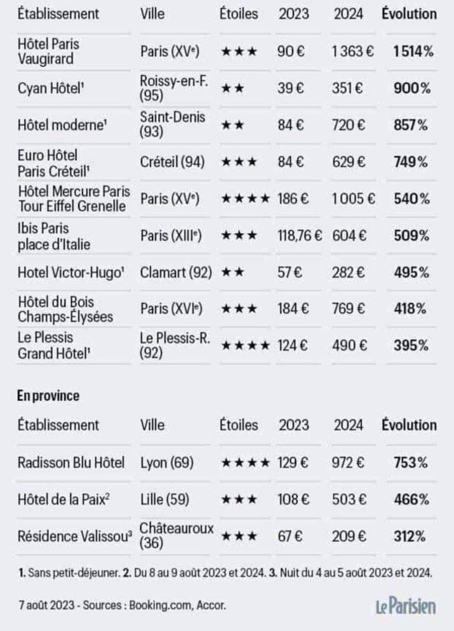其次是民間下場,酒店漲價,那是意料之中,巴黎伏吉拉爾酒店,目前一晚90歐,巴黎奧運會期間,1363歐一晚,漲幅超過1500%。平均下來,同一個房價的價格,飆升了6倍,便宜的也要摺合成人民幣2000多塊錢,有個中國小姐姐,就表示搶到了巴黎奧運會比賽的票,但酒店太貴去不了。巴黎,你醒醒,你是辦奧運會的,不是來搶劫的。
