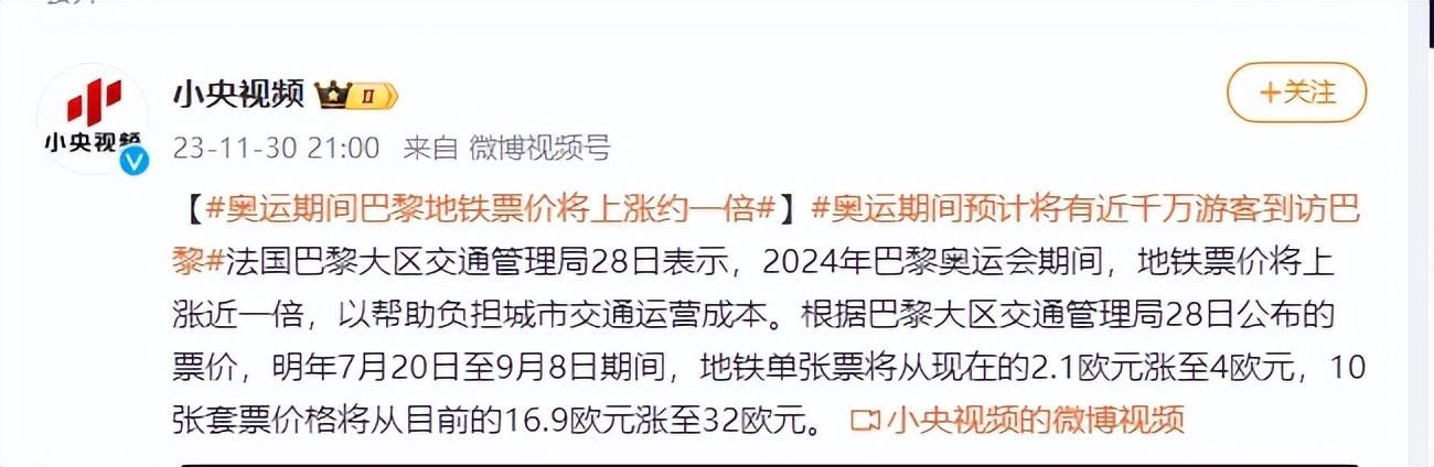 首先就是官方下場圈錢,原本,法國申辦奧運會時,提出的方案是,所有持票觀衆,都能免費乘坐公共交通。但是,離奧運會開幕式還有半年的時候,巴黎突然宣佈,地鐵漲價,平時巴黎地鐵要2.1歐,奧運會期間,4歐元哦;套票從16.9歐元,漲到了32歐元,主打一個免費那是不可能的,漲價纔是我們的目的!對此,巴黎政府也是振振有詞,說這個漲幅是公平的,那麼多遊客來巴黎看奧運會,地鐵班次得增加,服務奧運場館的8條線路的車次,得增加23%,特別繁忙的3條線,班次要增加60%-70%,爲此,我們還招募了300名司機,這些多出來的成本誰支付,當然是你們遊客啦,難不成還是由我們巴黎的居民來承擔。