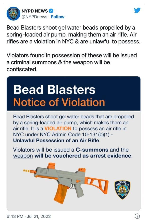 2022年,18歲男孩拿着水槍向外射擊,然後一個休班的獄警看到,他竟然在玩水槍,這怎麼能忍,直接把他給biubiu了。事後當地政府肯定來找補啊,說這個男孩玩的槍是奧比斯槍,這被認爲是氣步槍,在紐約市持有是非法的。