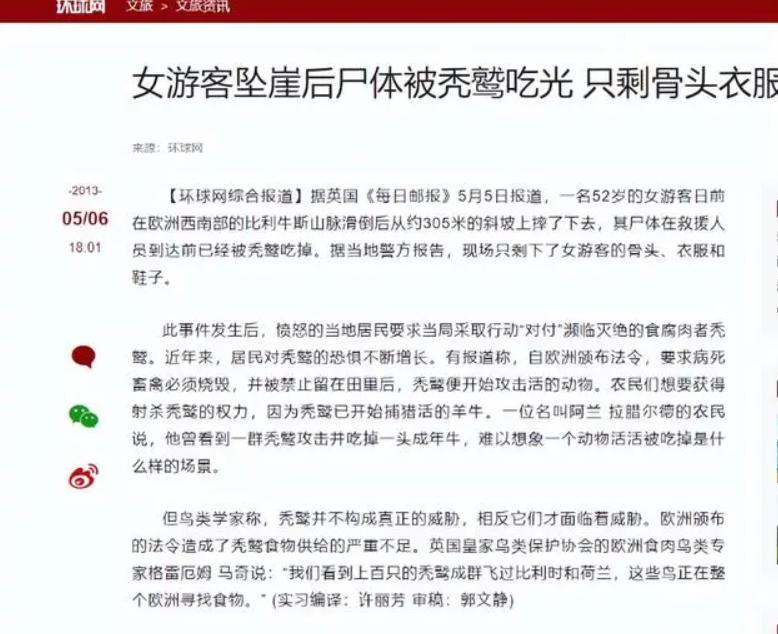 但在此前有新聞報道,禿鷲將一名疑似活着的女驢友喫掉,僅僅45分鐘就剩下一堆白骨,這是怎麼回事?