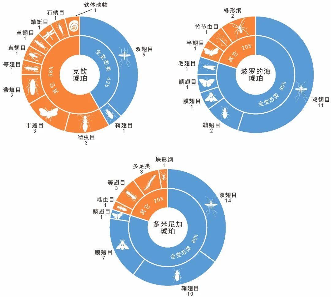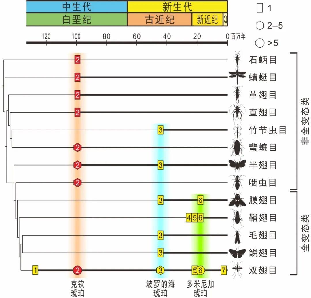 完全變態昆蟲出現的時間比不完全變態昆蟲晚。,雖然白堊紀時期已經佔了主流,但對琥珀化石的統計結果表明,在白堊紀中期的緬甸克欽琥珀中,被索線蟲寄生的9個昆蟲目中只有一個目屬於全變態類昆蟲,而在波羅的海琥珀中,6個昆蟲目有4個都是全變態類昆蟲,在多米尼加琥珀中,3個昆蟲目全部都是全變態類。