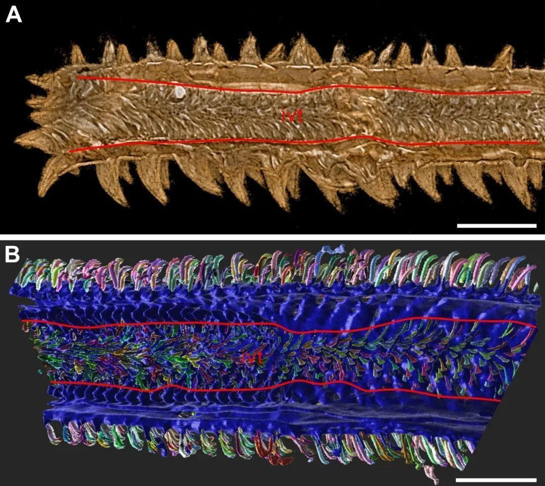絛蟲化石內部結構(A)與現生錐吻目(B)的比較。縮寫:ivt—未完全伸出的錐吻。
