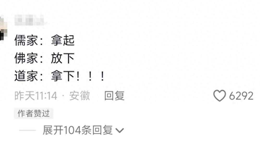 儒家說,拿起,佛家說,放下,輪到道教了,直接拿下,其他教宣揚我不入地獄誰入地獄,道教卻說,死道友不死貧道!一些教說戒嗔,普渡衆生,輪到道教發言,他自己想捱罵你成全了他,髒話要是沒說出口必會鬱結於心,擾我道心!女生要按照這套理念入世,