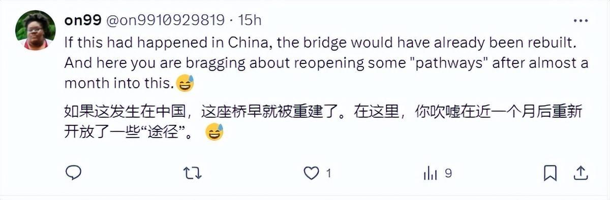 其實吧,美國的救援效率,不光是我在吐槽,連美國人都看不下去,說這要是在中國,這座橋早就被重建了,在美國,你竟然吹噓,在1個月後,重新開放了一個“通道”。