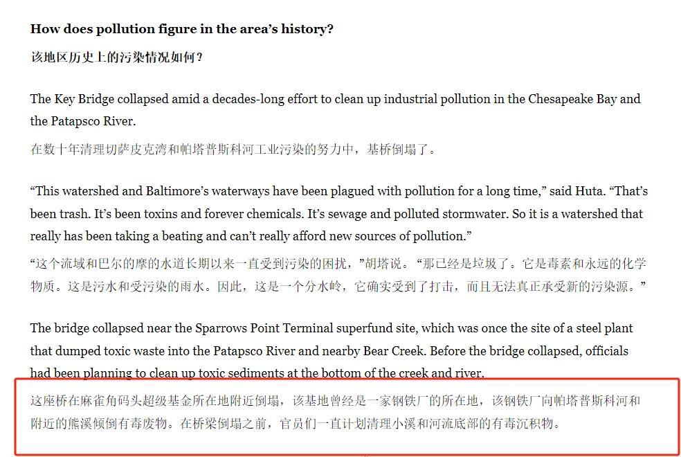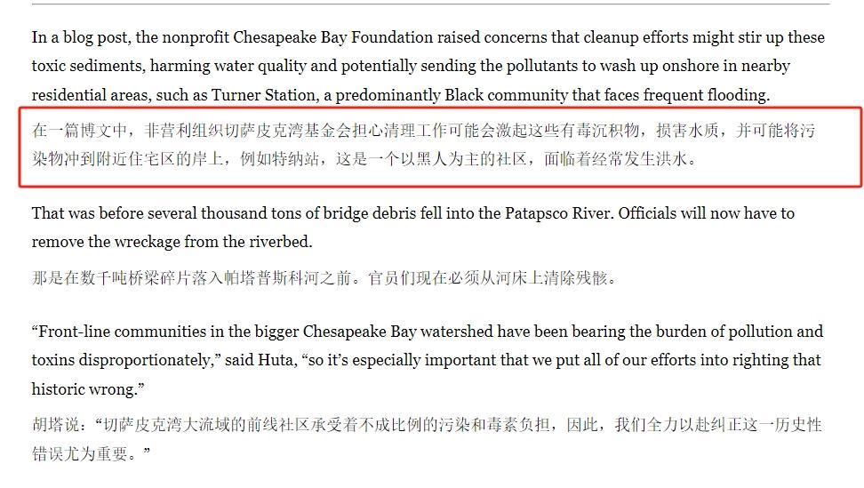 而且,民主黨對環保非常重視,所以清理大橋殘骸和重建工作,也要經過環境許可程序。這個我真的是要說幾句,就是清理大橋殘骸的時候,非營利組織切薩皮克灣基金會表達了擔心,擔心啥呢?別看歐美天天喊着環保、環保,實際上, 他們在發展的時候,是極其不重視環保,這個港口附近,曾經有個伯利恆鋼鐵廠,他們直接將有毒廢料,倒到了帕塔普斯科河和附近溪流,這幾條河流向了切薩皮克灣,也就是巴爾的摩大橋所在地,有毒物質就在這沉降,這麼多年了,在海牀裏也穩定了。現在你一清理河道,那有毒沉積物不就又進到海里面了嘛,那海里的魚怎麼辦,海里的蝦怎麼辦,海里的泥鰍怎麼辦,哦,海里沒有泥鰍。
