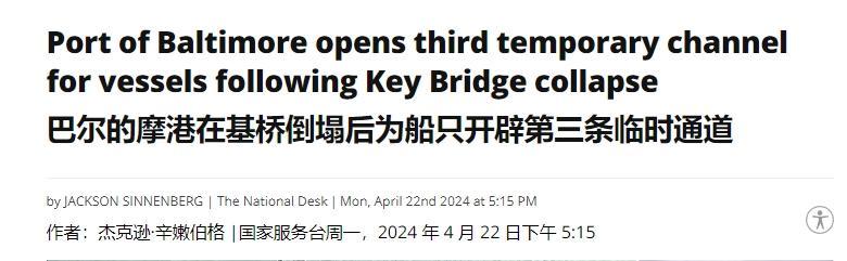 結果呢,現在距離事故都已經1個月了,船還沒挪走呢,港口還沒恢復正常呢。雖然4月19日,巴爾的摩港官員表示,開通第3條臨時通道,但是,這個臨時通道深6.1米,水平間隙91.4米,垂直間隙41.2米,但是這條通道只能滿足大約15%的商業活動,大船還是走不了,還是要快點挪走這個擋路的船纔行。