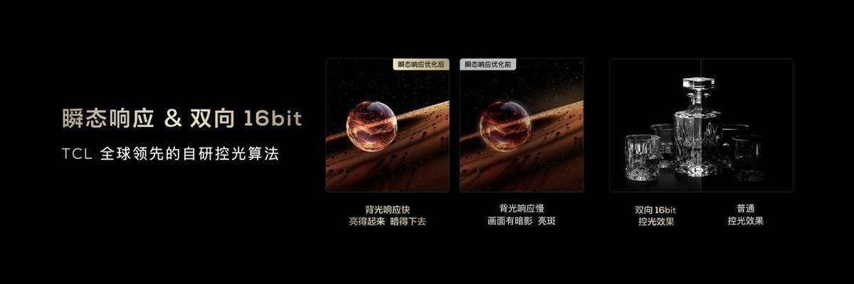 另外,TCL全域光暈控制技術還新增了背光響應算法,其中的瞬態響應,可以讓運動的畫面更清晰,降低算法延遲帶來的拖影。雙向16bit則帶來了更強的控光精度,讓畫面更震撼。