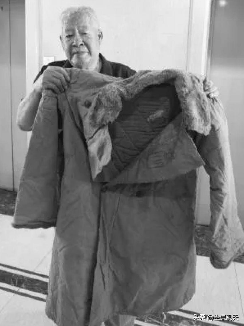 【老人展示曾經戰場上繳獲的日軍軍大衣】