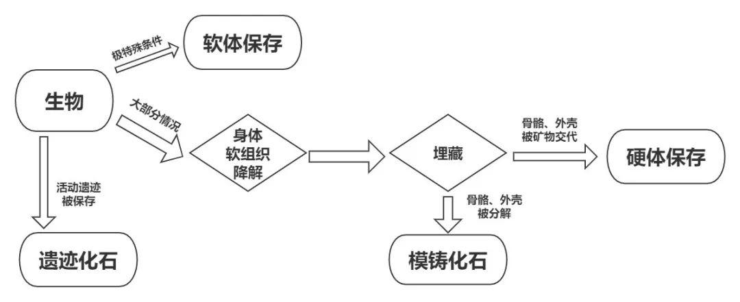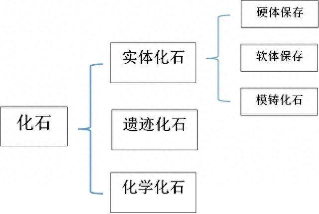我們日常見到的化石絕大部分都是實體化石,實體化石又可以分爲三類,硬體保存、軟體保存、模鑄化石。提到化石,我們最先想到的就是硬體保存的實體化石(Hard body preservation),像生物骨骼化石、植物化石等。