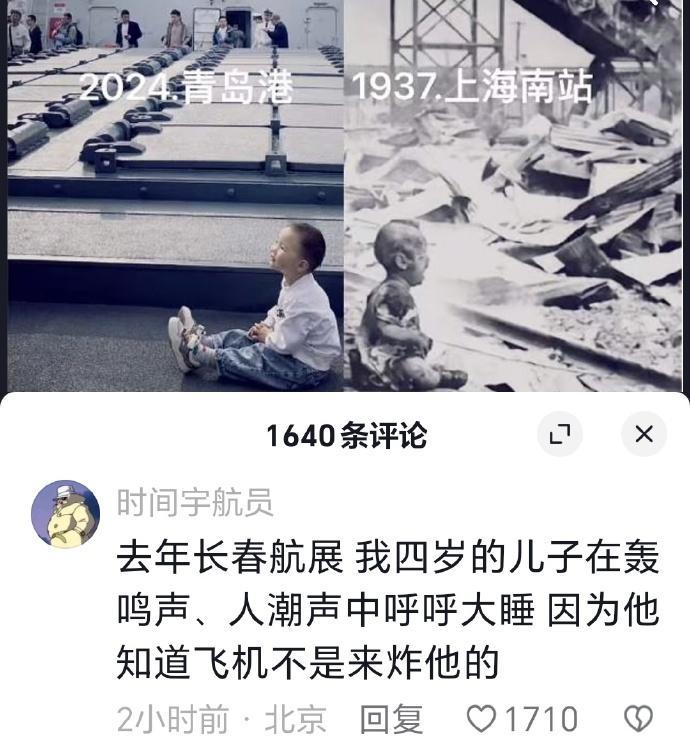 這張照片是最近在中國海軍75週年開放日活動中拍攝的,一個孩子在軍艦上,這兩張照片形成的鮮明對比,也讓我們深知此時此刻的來之不易。