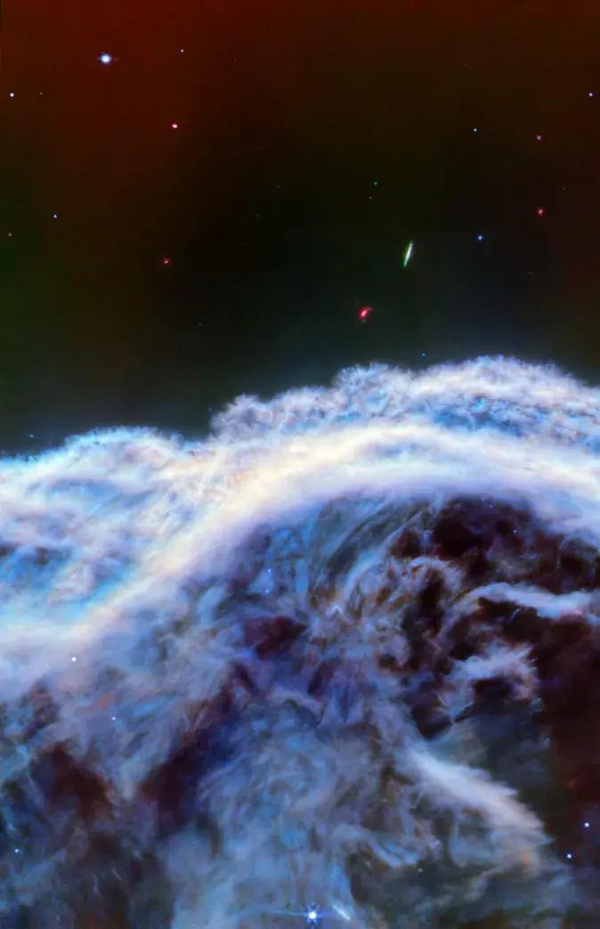 天文學家藉助韋伯的精密儀器,首次揭示了星雲發光邊緣的微妙結構,見證了塵埃被氣體加熱並從雲中席捲而出的壯觀場景,整個圖像(第三圖)寬幅約0.8光年。