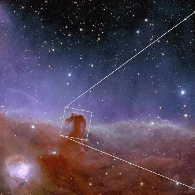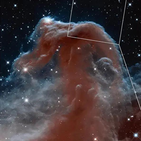 馬頭星雲,距地球約1300光年,如同宇宙中的孤島,靜靜地躺在星海之中。它的形狀宛如一匹駿馬,由藍灰色的冷分子氫雲與上方紅色的原子氫氣所構成,如同星光繪製的浩瀚詩篇。