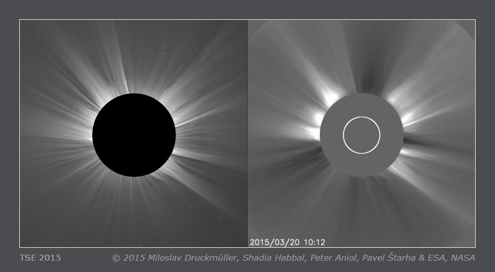 日全食和日冕儀對比(攝影師:© 2015 Miloslav Druckmüller, Shadia Habbal, Peter Aniol, Pavel Štarha & ESA, NASA)