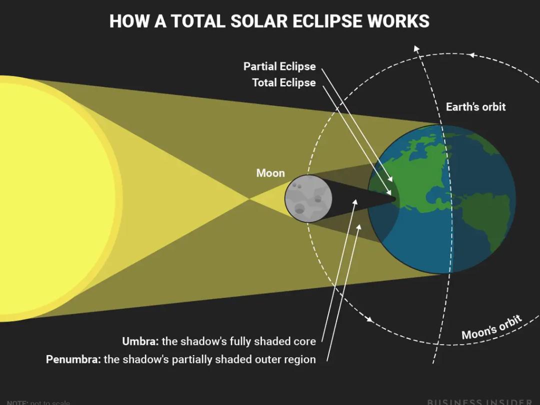 本影和半影的示意圖 (圖片來源:https://www.businessinsider.com/solar-eclipse-diagram-2017-8)
