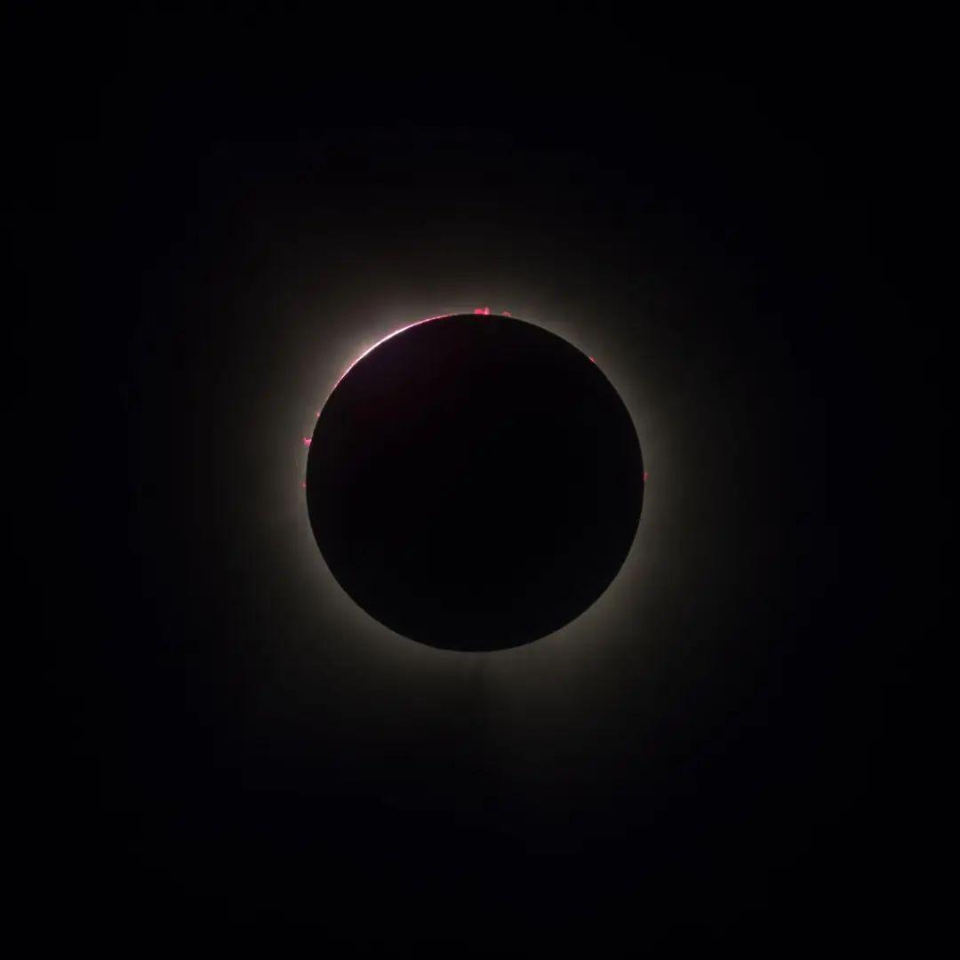 在食甚後,日全食天象最抓眼球的特徵莫過於月球外的那些星星點點的鮮紅色結構,這就是色球層,其中特別突出的部分被稱爲日珥(Prominence)。
