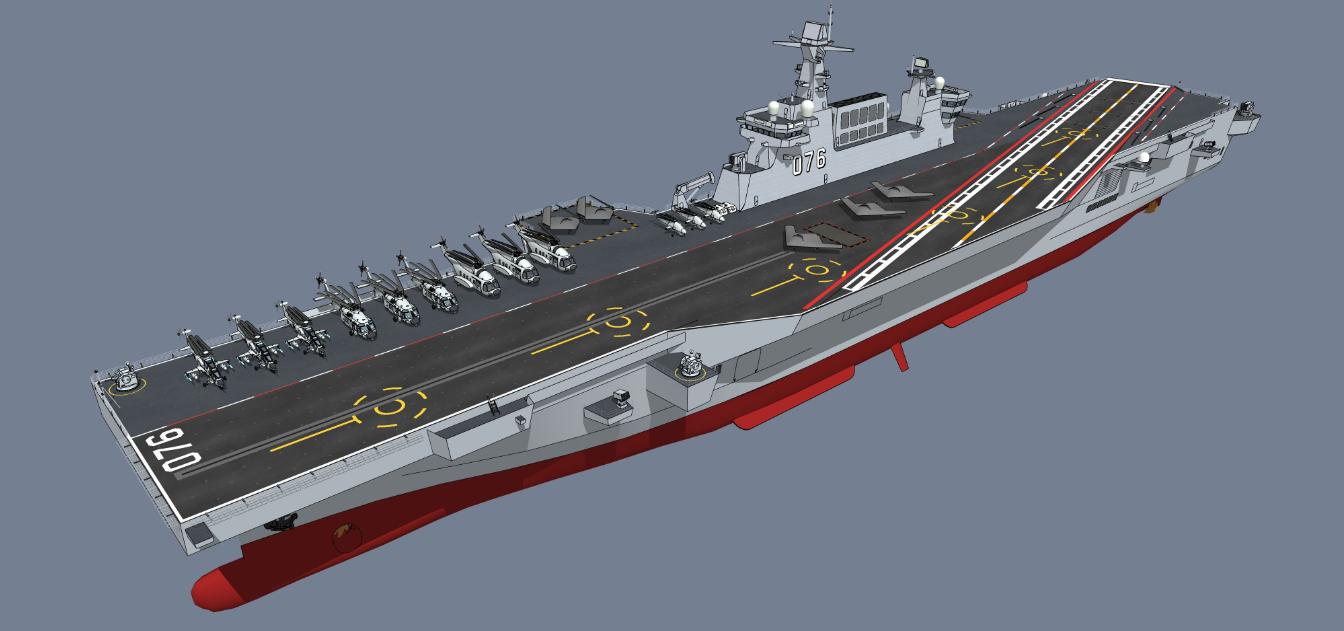 現在076型兩級攻擊艦有了明確的好消息,1號艦建造工作已經進展到吊裝側面船舷部分,分段加工的方式,能夠讓兩艦的整體工作得到有條不紊地提速,而且大外飄設計更爲先進,夾板更加寬闊,讓艦載機的活動面積增加,可以快速執行起飛降落,076的甲板艦面規劃會超過美國級。