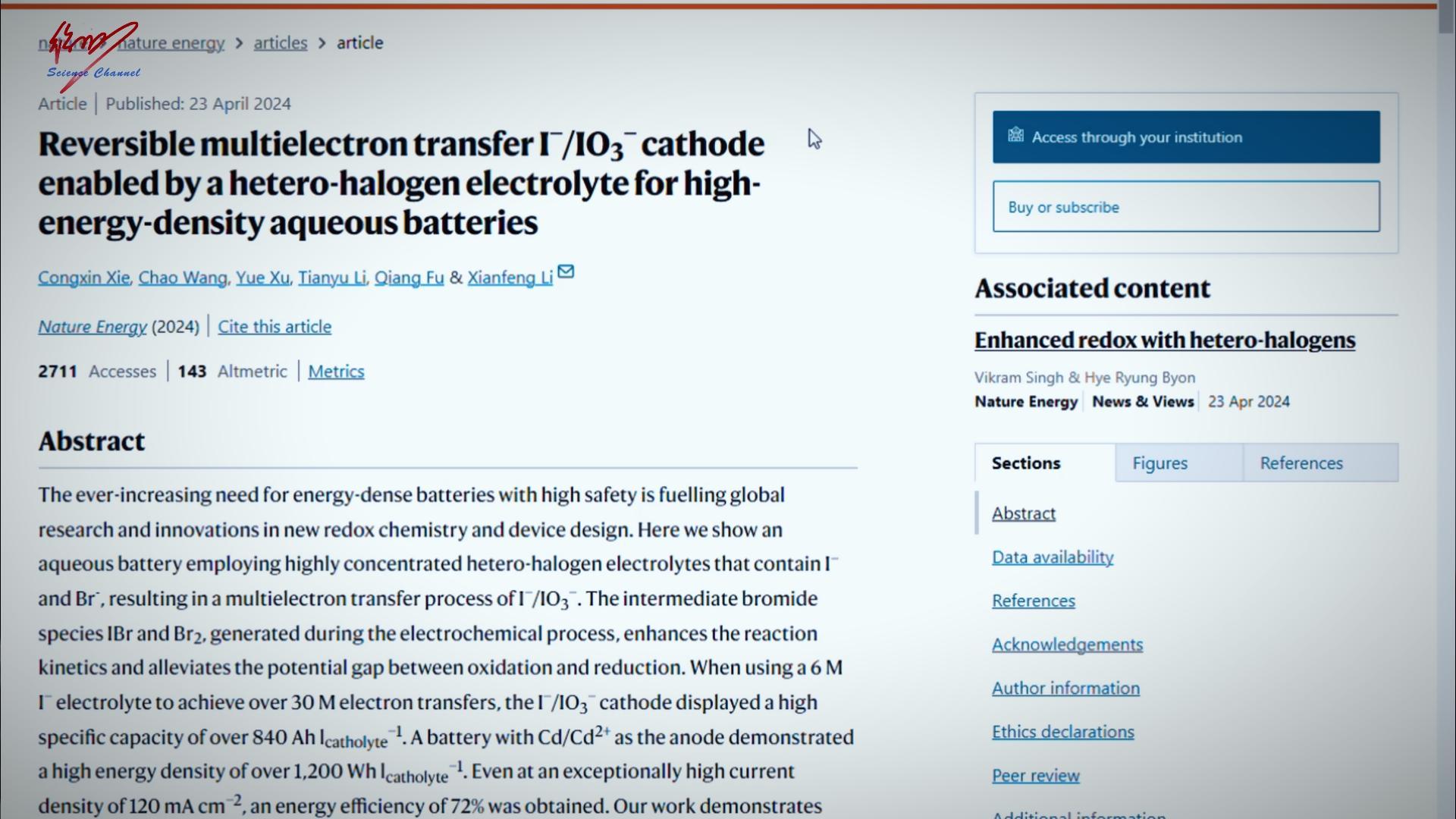 這項研究來自中科院大連化學物理研究所李先鋒、傅強教授領導的團隊,他們開發出一種基於鹵素多電子轉移的高能水系電池,能量密度竟高達1200Wh/L,是目前能量密度最高的水系電池,而且是數量級的提升,而目前商用鋰離子電池大多在400-700Wh/L。