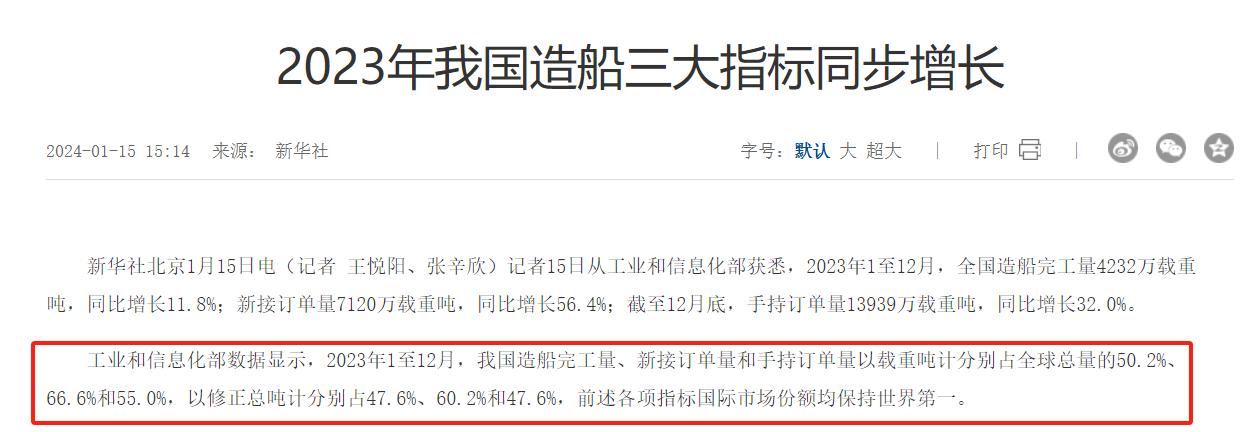 在船舶領域,中國造船能力已超過美國200多倍,成爲全球唯一集齊造船工業“皇冠上三顆明珠”的國家,這三顆明珠是航母、大型郵輪、LNG船。2023年,我國造船完工量、新接訂單量和手持訂單量,國際市場份額均保持世界第一。