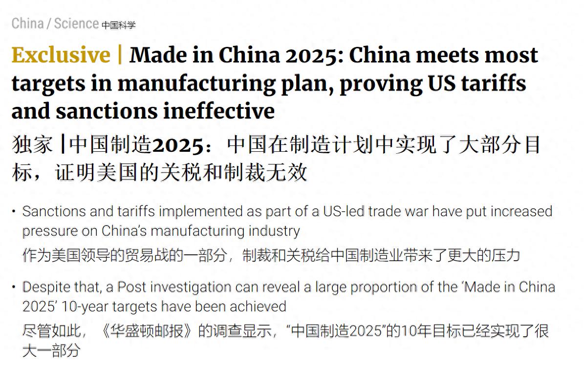 2015年5月,中國製定了一個非常宏大的目標:中國製造2025,涵蓋了十大重點領域。現在還剩8個月,那結果咋樣了呢?《南華早報》梳理了官方以及其他權威資料,得出一個結論:中國實現了超過86%的目標。要知道這10年裏,有近7年,美國對華發動貿易戰,這其實也說明,美國的制裁根本攔不住中國,反而讓我們變得更強。