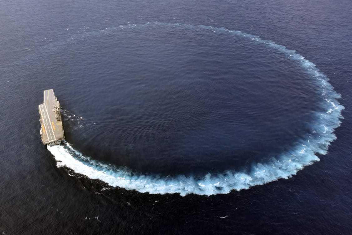 你再看看福建艦這個轉彎的航跡,非常光滑、流暢,這個就非常完美,說明福建艦的機動性能比較好,動力系統能夠支撐航母進行高速機動。這個呢,就比較重要啊,在戰時,航母會成爲對方的靶子,要靠機動性躲避攻擊。