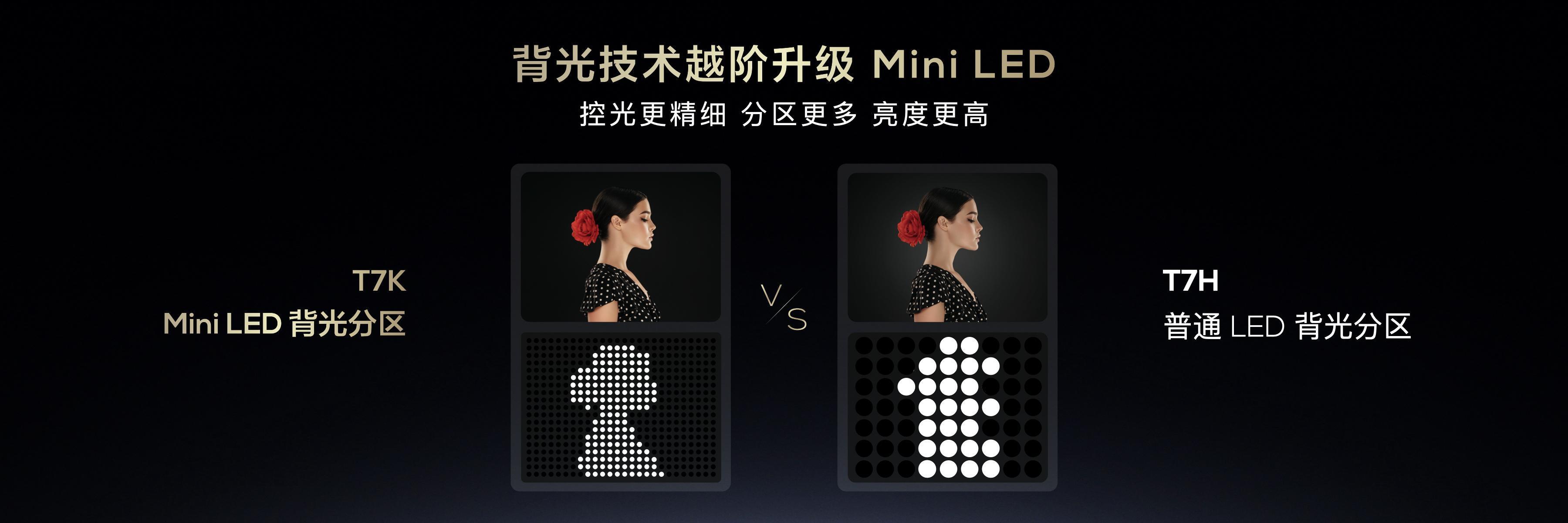 對於Mini LED電視而言,背光分區是決定畫質的關鍵性因素之一。電視背光分區的多少,決定了畫面純淨度、明部和暗部的細節呈現。TCL T7K對背光技術進行了升級,和傳統LED背光相比,Mini LED發光芯片更小。T7K系列最高可達960背光分區,想象一下,入購一臺98吋的巨幕電視,960分區的Mini LED矩陣,如同夜空中繁星,精密佈局在T7K的屏幕背後。這不僅僅是個數字遊戲,而是每一分區都能獨立調節亮度,帶來細節滿滿的光影層次感。