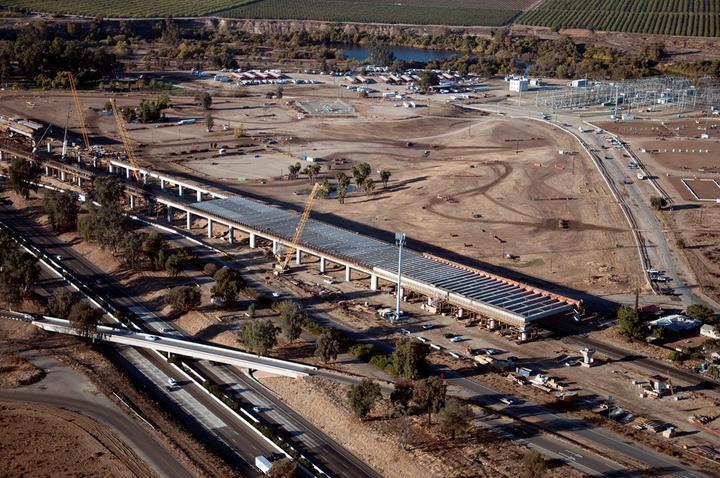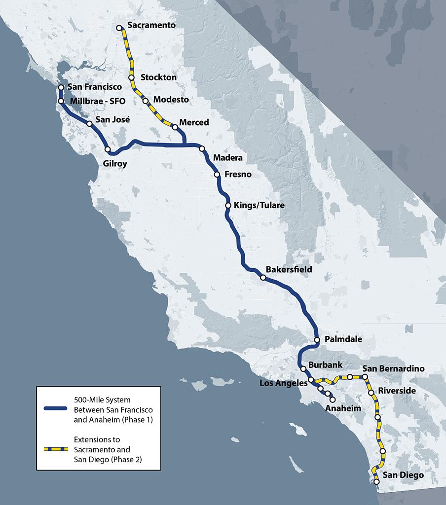 原來啊,這個橋是準備給加州高鐵用的。加州高鐵,你或多或少也聽過它的大名,2008年開始規劃修建,連接舊金山到洛杉磯,當時預算是330億美元,過去開車要6個多小時,坐飛機要1個多小時,高鐵開通之後只要2個半小時。