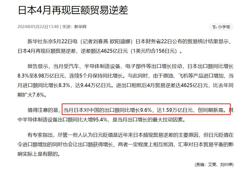 其實,日本貿易逆差的根本原因,是它的產品競爭力下降了。日本過去的好日子,主要是靠汽車、半導體產業,你看日本4月份,對華出口額同比增長了9.6%,達到了1.59億日元,主要原因,就是咱們從日本進口了大量的半導體制造設備,但是儘管如此,我國對日本還是貿易順差。