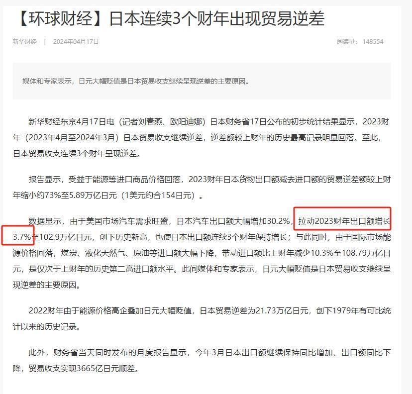另外就是,日元貶值,導致日本從國際上買東西變貴了,不過另一方面,日元貶值有利於出口啊,你看啊,2023財年,日本出口額還增長了3.7%。只不過出口額增幅,沒有出口增幅高,日本還是貿易逆差。