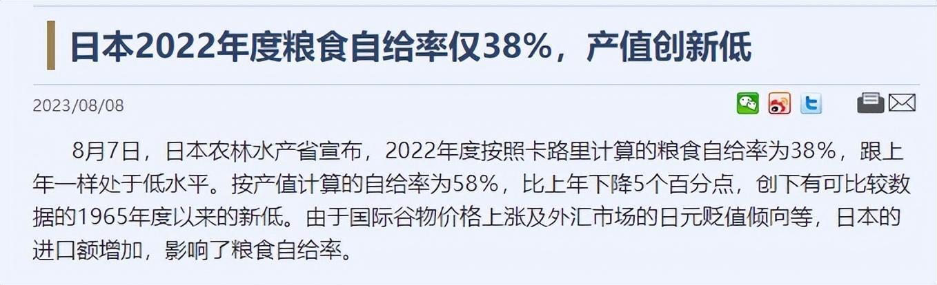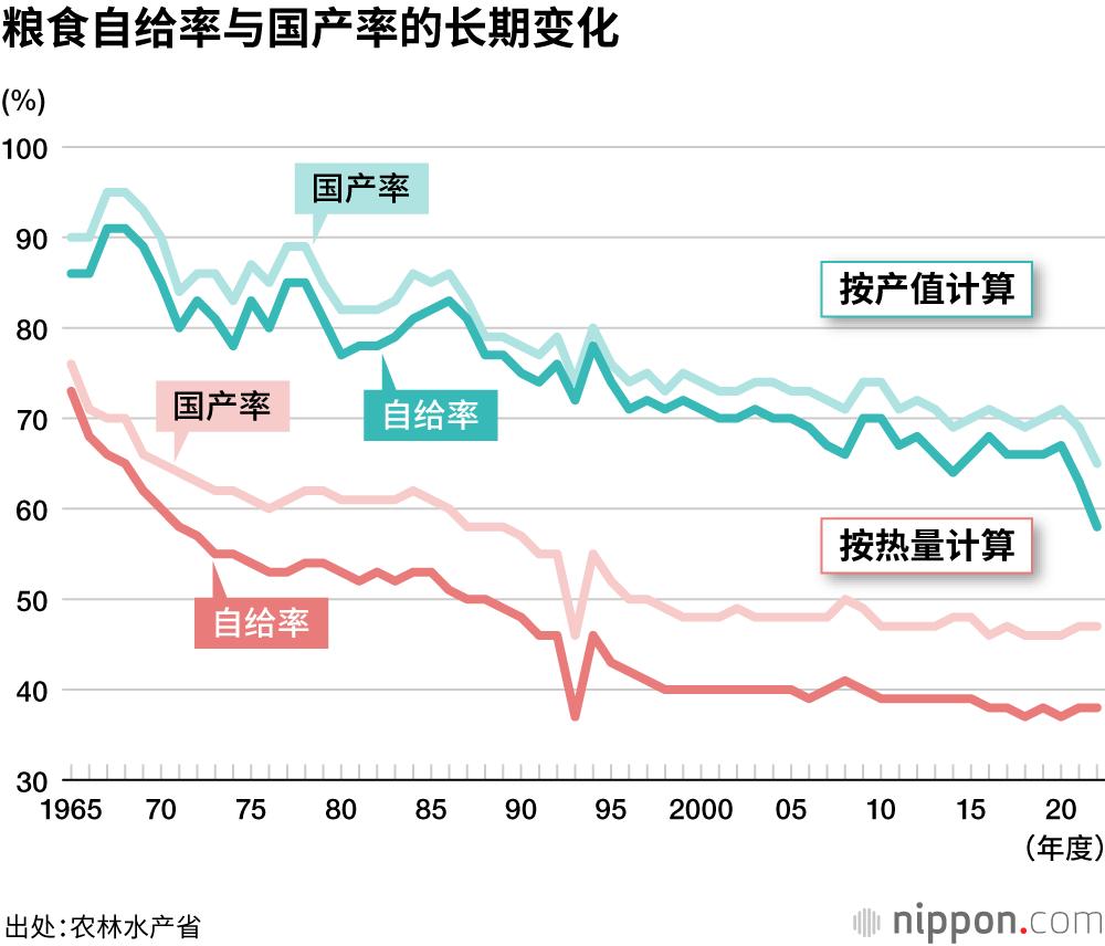 更重要的是,日本的糧食沒法自足,無論是按產值還是按熱量,日本糧食自給率都很低,其中按照熱量計算,自給率常年低於40%,需要從國際上購買大量糧食。