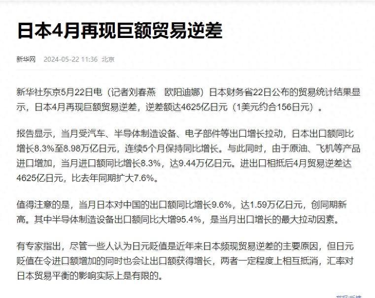 2024年1月,日本貿易逆差爲1.76萬億日元,2月貿易逆差,2809億日元;3月終於是貿易順差,3664.67億日元;結果4月又是貿易逆差,4625億日元。