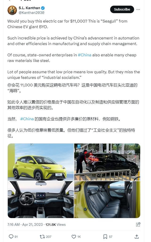 你肯定會說,啊中國的車子便宜,是因爲人工便宜?當然不是啦,否則印度的車子將天下無敵了,他們表示,比亞迪海鷗之所以那麼便宜,是因爲中國有健全的產業鏈,以及垂直整合能力強。