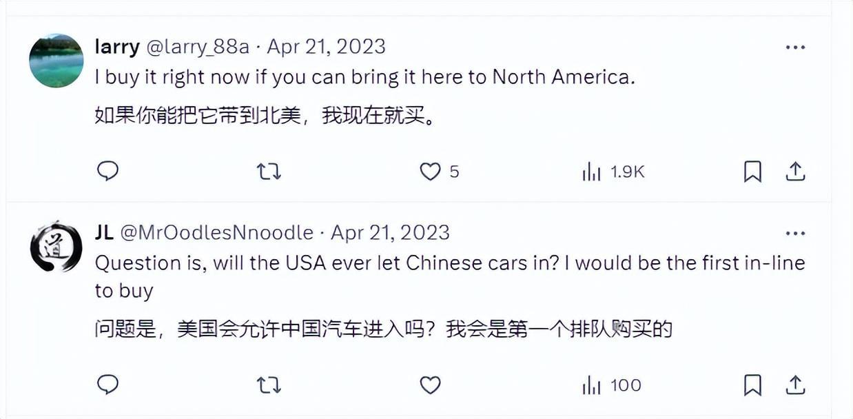 中國電動車在設計、工程和執行方面高效且簡單,但具有意想不到的質量和預期的可靠性。同時也對美國汽車表達了擔憂,他們表示,2年前,中國製造商,在歐洲幾乎沒有銷售任何電動車,但是現在佔據了電動汽車市場10%的份額。如果中國汽車到了美國市場,美國車企將毫無招架能力。