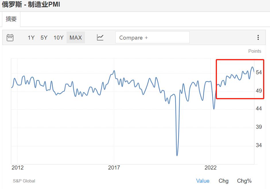 我還看了一下俄烏戰爭以來的工業生產指數,處於歷史高位,大於50,都是在擴張區間。