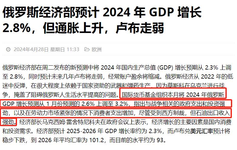 那會不會是數據注水,結果我發現,國際貨幣基金組織預測,2024年俄羅斯GDP將增長3.2%,比1月份預測的2.6%,上升0.6個百分點,這增長率是要比G7任何一個國家都要多。還有不少全球的經濟機構,也同樣看好今年俄羅斯的經濟增長,這就很離譜了。