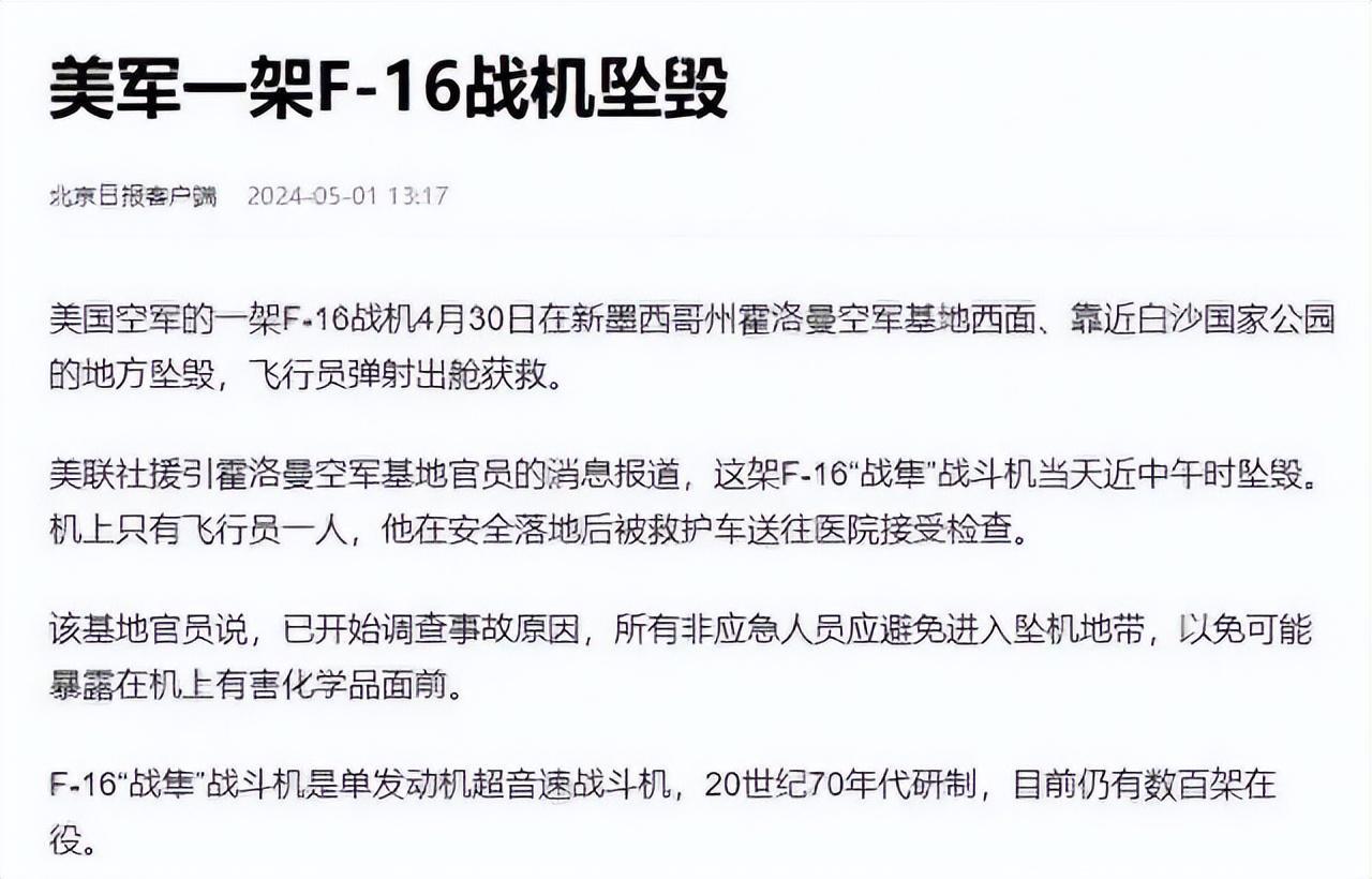 2023年,阿美莉卡以摔機13架遙遙領先,2024年雖然剛剛過去一半,但是已經摔了一架F16,一架F22,2月初摔了一架直升機5人遇難,3月又摔了一架直升機,3人遇難1人受傷。