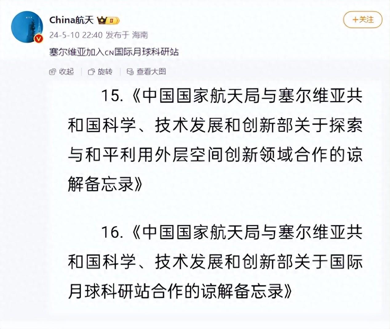 嫦娥六號還沒登月,又有國家參與中俄主導的國際月球科研站了。塞爾維亞,咱們的賽鐵,正式加入國際月球科研站項目,恭喜恭喜,以後塞爾維亞出門,也可以橫着走了,說不會吧,你們連抱大腿都能抱錯,誰不知道,當今世界,想登月,得找中國啊。