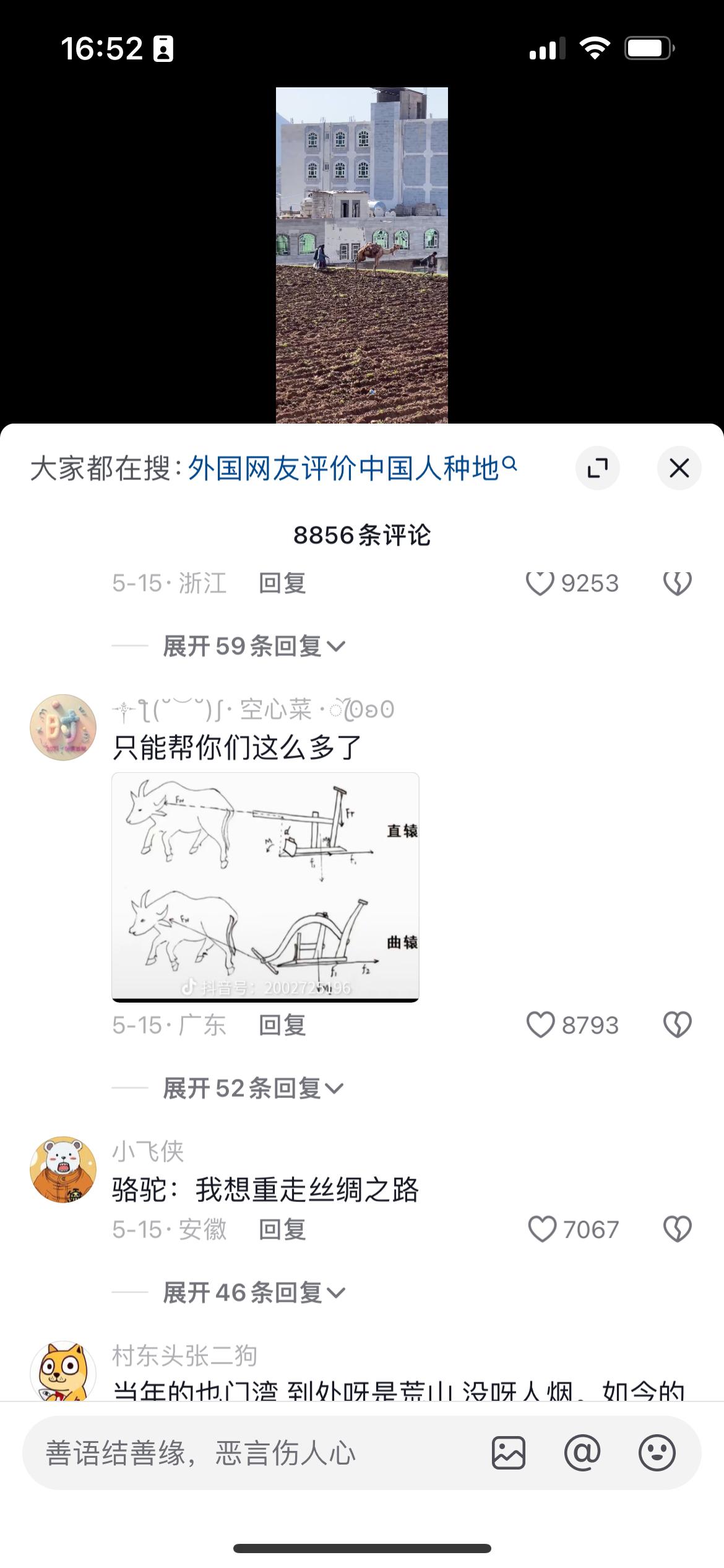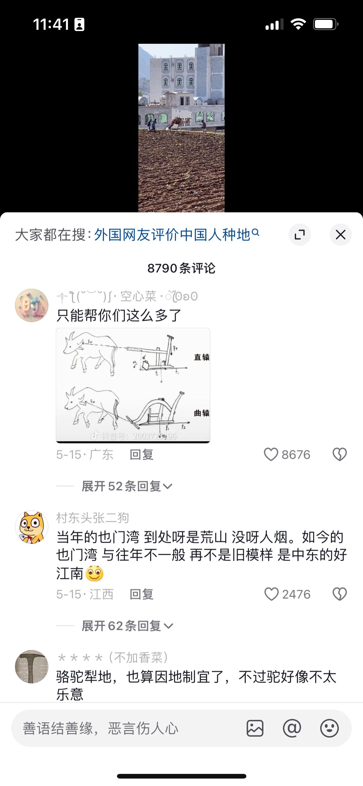 也門人描述在中國網友的指導下,用了駱駝犁地也算因地制宜,屬實省力,可看情況它也不樂意,導致人家想重走絲綢之路過來打我們!終於來自東方的活爹,發現駱駝腳太高效率慢,放棄了這個想法,幫人幫到底繼續在評論區出謀獻策,建議改用牛犁地,