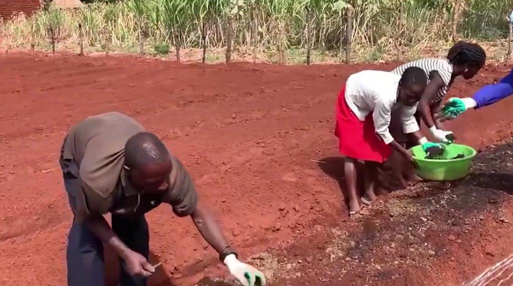接着去幾十公里外拉了十五袋牛糞與草木灰攪和在一起,成了綠色天然肥,植物離不開水,村民甚至挖了一天溝渠蓄水灌溉,與此同時預定的紅薯苗也安排上,人多力量大,撒肥,種廟,封土,場面雖熱鬧但大家分工有序,70天后荒地一片碧綠,